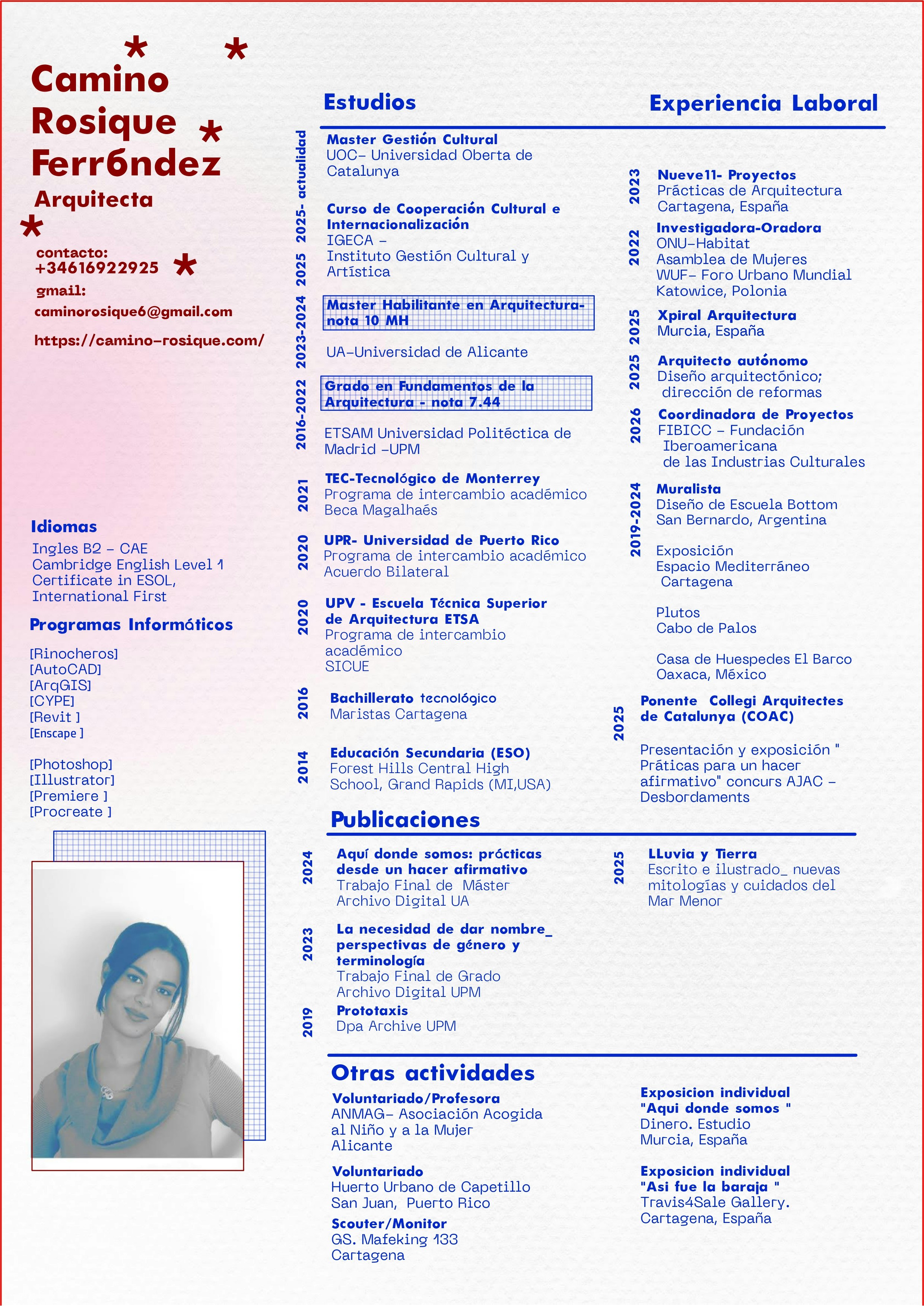 Soy Camino Rosique, arquitecta por la ETSAM (Universidad Politécnica de Madrid,Master Habilitante en la Universidad de Alicante), nacida en Cartagena en 1998. Configuro mi ejercicio profesional a través de la exploración de prácticas material-discursivas que permiten producir pensamiento. Investigo metodologías como el hackeo o el activismo artístico, estrategias que descentralizan o se alejan, por su aparente indisciplina, de los lugares donde tradicionalmente se produce el conocimiento autorizado en la arquitectura.