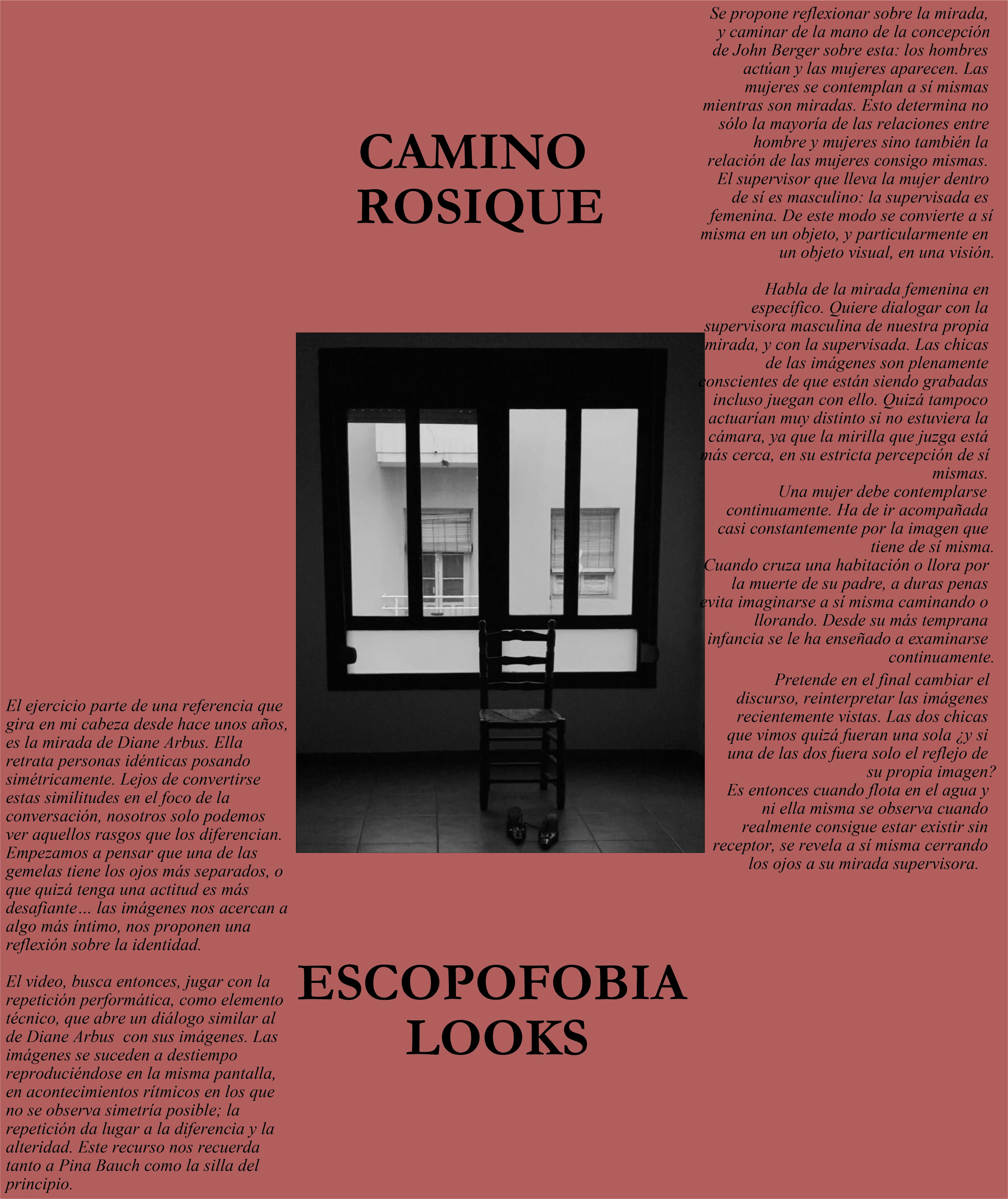 Se propone reflexionar sobre la mirada, y caminar de la mano de la concepción de John Berger sobre esta: los hombres actúan y las mujeres aparecen. Las mujeres se contemplan a sí mismas mientras son miradas. Esto determina no sólo la mayoría de las relaciones entre hombre y mujeres sino también la relación de las mujeres consigo mismas. El supervisor que lleva la mujer dentro de sí es masculino: la supervisada es femenina. De este modo se convierte a sí misma en un objeto, y particularmente en un objeto visual, en una visión